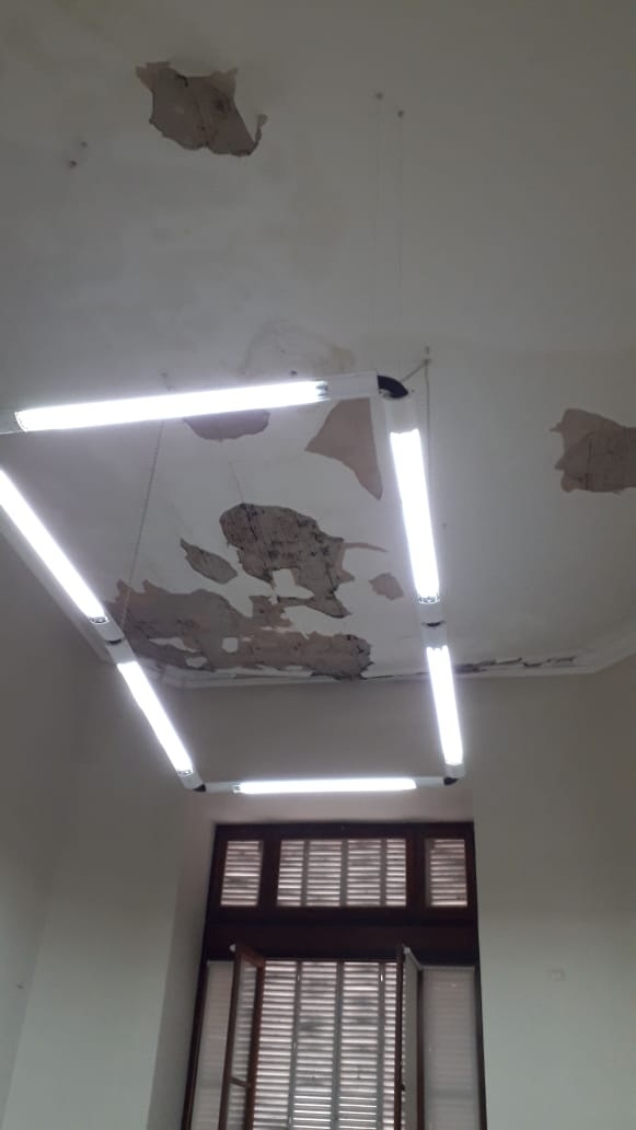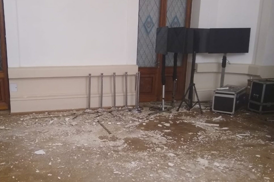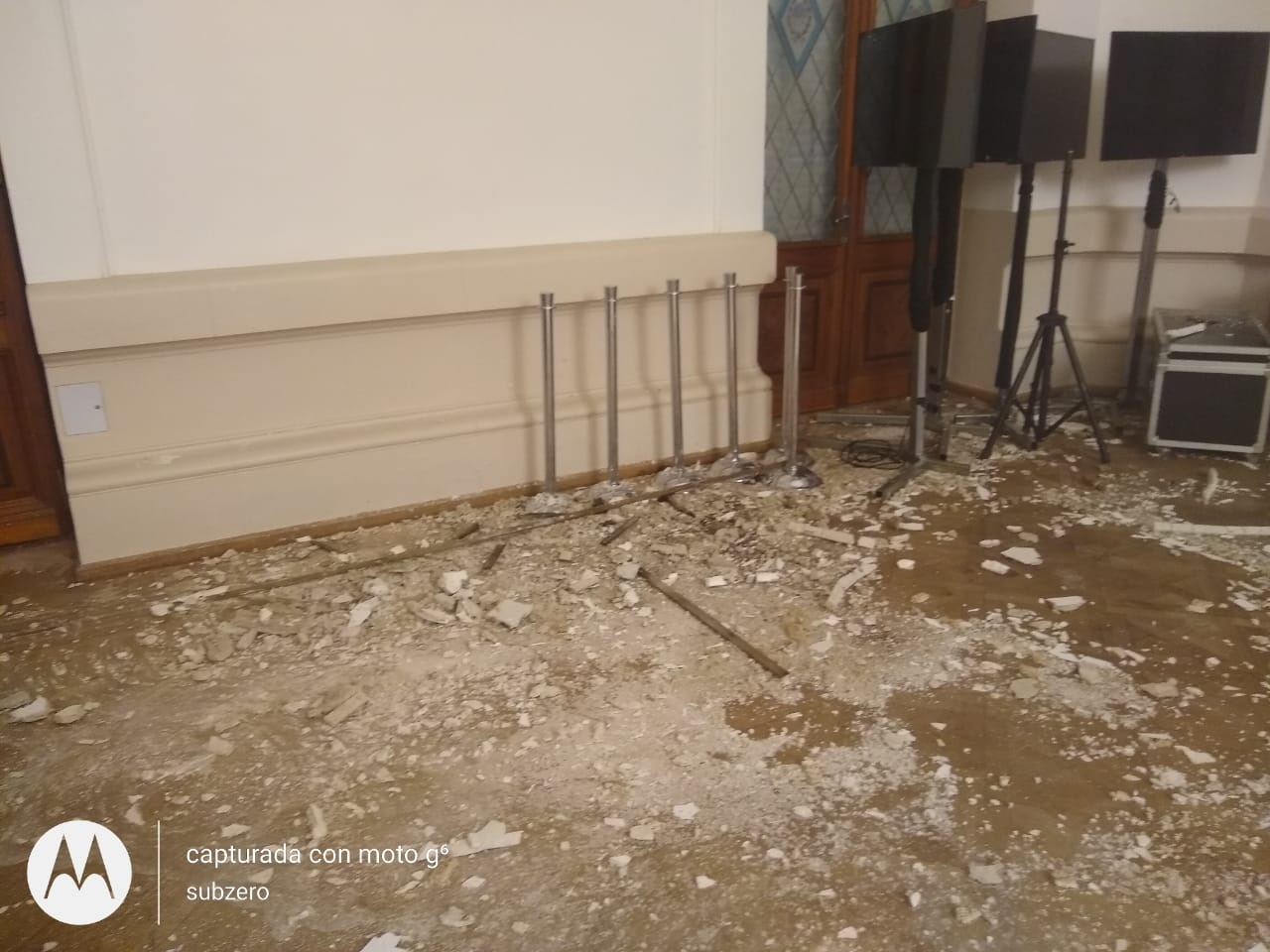 Uno de los lugares que se vio más afectado fue la Casa de Gobierno donde el temporal provocó el desprendimiento de mampostería y techos tanto en el Salón Blanco, así como en otros sectores del edificio gubernamental.