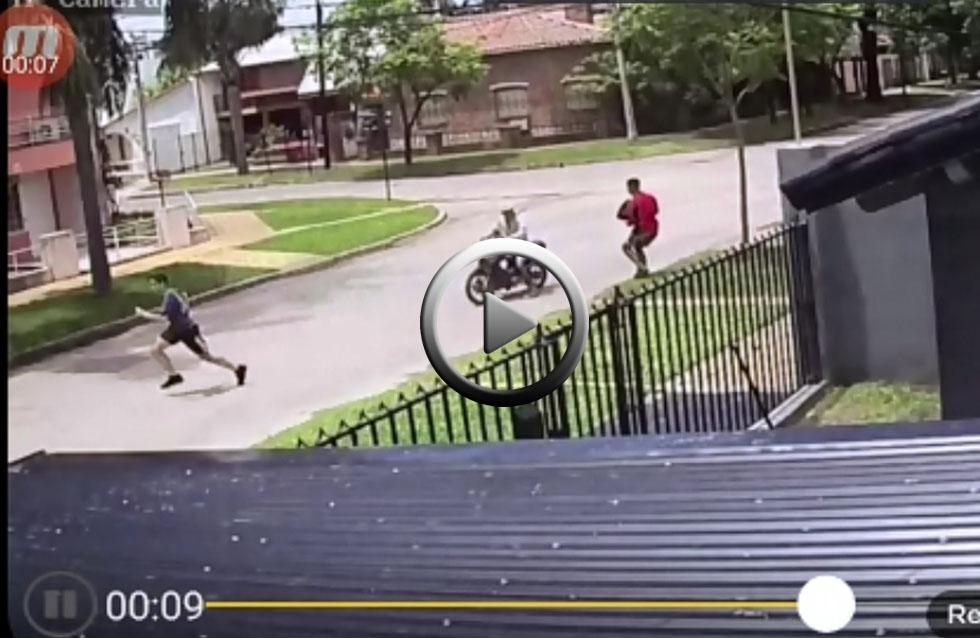 En el mediodía de hoy, dos motochorros atacaron a un joven que se encontraba esperando a unos amigos en la puerta de su casa. En la filmación captada por una cámara de seguridad, se puede ver cómo dos sujetos ingresan rápidamente a la boca calle y se ponen a la par del joven para realizar el robo. En ese momento el acompañante se lanza de la moto, ataca a la víctima y ya con la mochila del muchacho como botín se sube nuevamente a la moto para darse a la fuga en contramano.