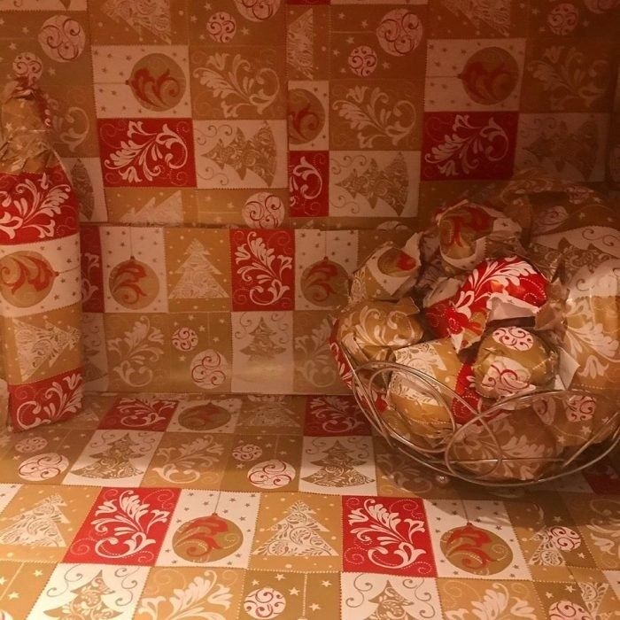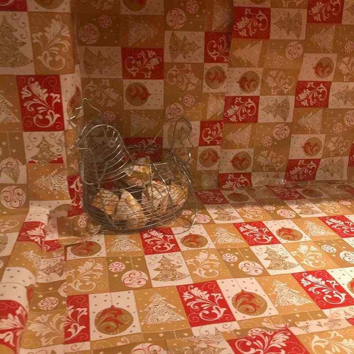 Carl Mullen King pensó que sería divertido envolver todos los objetos de la cocina con papel, de colores rojo y dorado, y cubrió cada parte del cuarto, junto con el piso, la heladera, la alacena y hasta huevos que estaban apoyados sobre la mesada, para por último colocar un pequeño duende de peluche sobre el envoltorio.