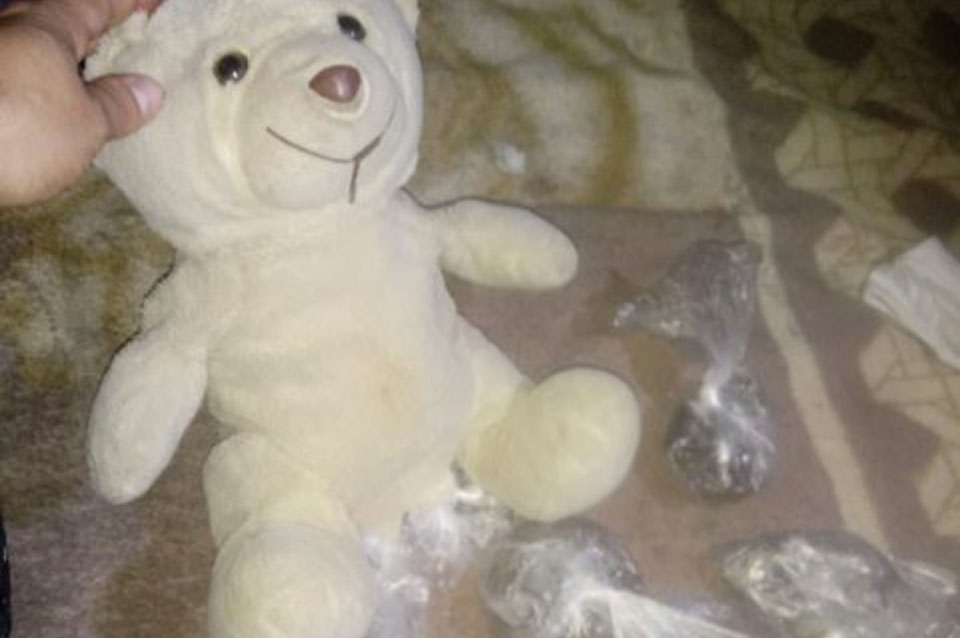Una vez que los uniformados entraron a la casa y detuvieron a los ocupantes, se encontraron con el oso de peluche de color blanco con algunas costuras rasgadas.