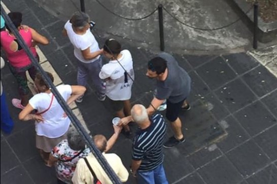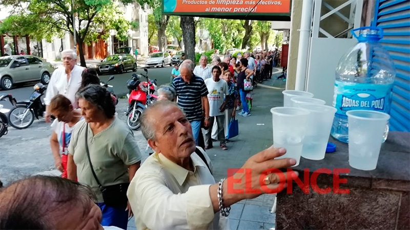 En el Banco de Entre Ríos la fila de jubilados para cobrar el bono llegaba a 300 metros en una jornada de agobiante calor y eso fue lo que observó Pablo de Bueno quien ante la situación fue en busca de hielo, bidones de agua y vasitos para repartir a las personas que esperaban bajo el sol su turno para ingresar a los cajeros.