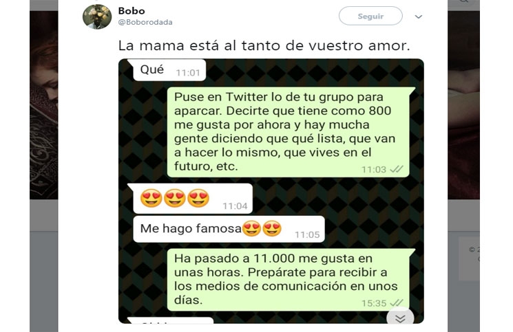 Su hijo, bajo el seudónimo de su usuario de Twitter ‘@Boborodada’, publicó una serie de capturas de pantalla que acompañó con este texto: “Os cuento que la mamá tiene un grupo whatsapp en el que está ella sola para apuntar dónde aparca”.