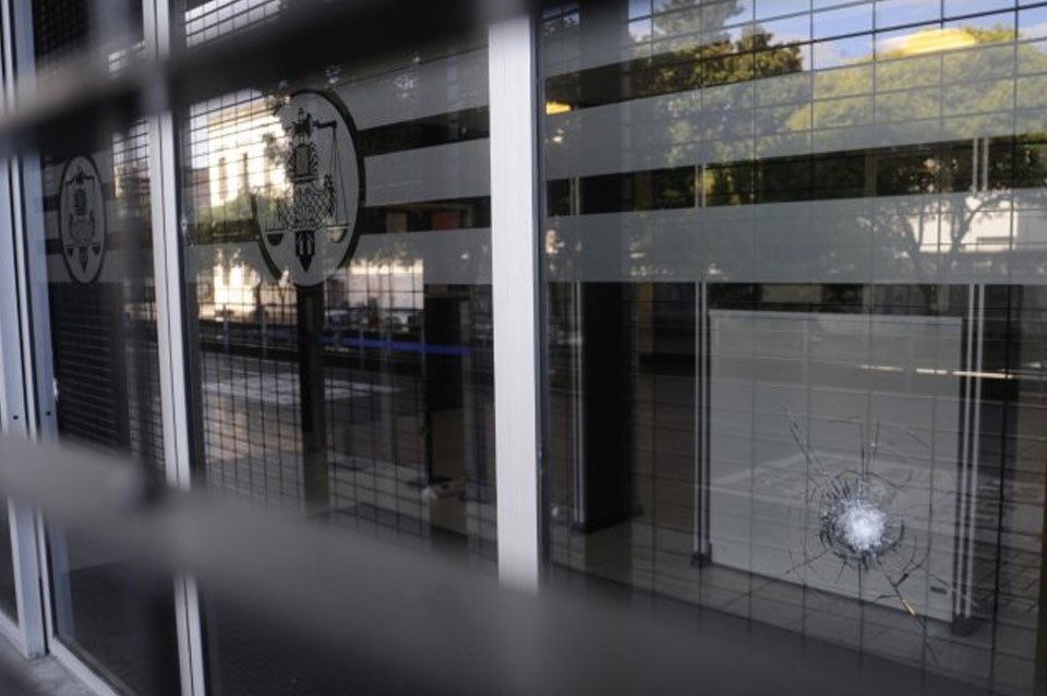 Los agentes policiales de la custodia informaron que dos individuos pasaron frente al edificio a bordo de una motocicleta y dispararon contra los cristales de la entrada.