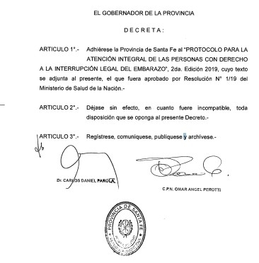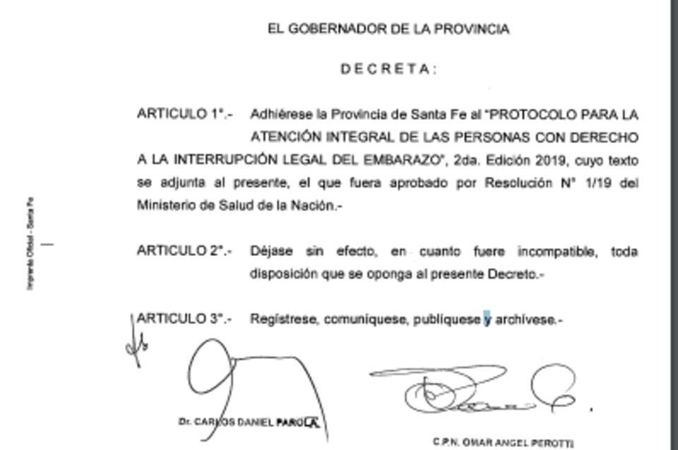El gobernador firmó el decreto de adhesión de la Provincia de Santa Fe al Protocolo para la Interrupción Legal del Embarazo (ILE), publicado en el Boletín Oficial por el Ministerio de Salud de la Nación el viernes 13 de diciembre de 2019.