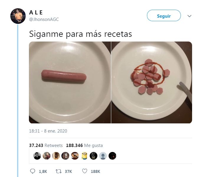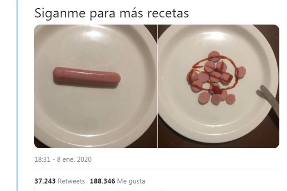 Hace dos días, el miércoles 8 de enero, Ale (@JhonsonAGC) publicó un tweet que causó risas online y se viralizó. En el posteo, adjuntó dos imágenes: en la primera, se ve un plato con una salchicha. En la segunda, la salchicha fue cortada en rodajas y tiene ketchup encima. Como descripción, el joven escribió “Síganme para más recetas”.