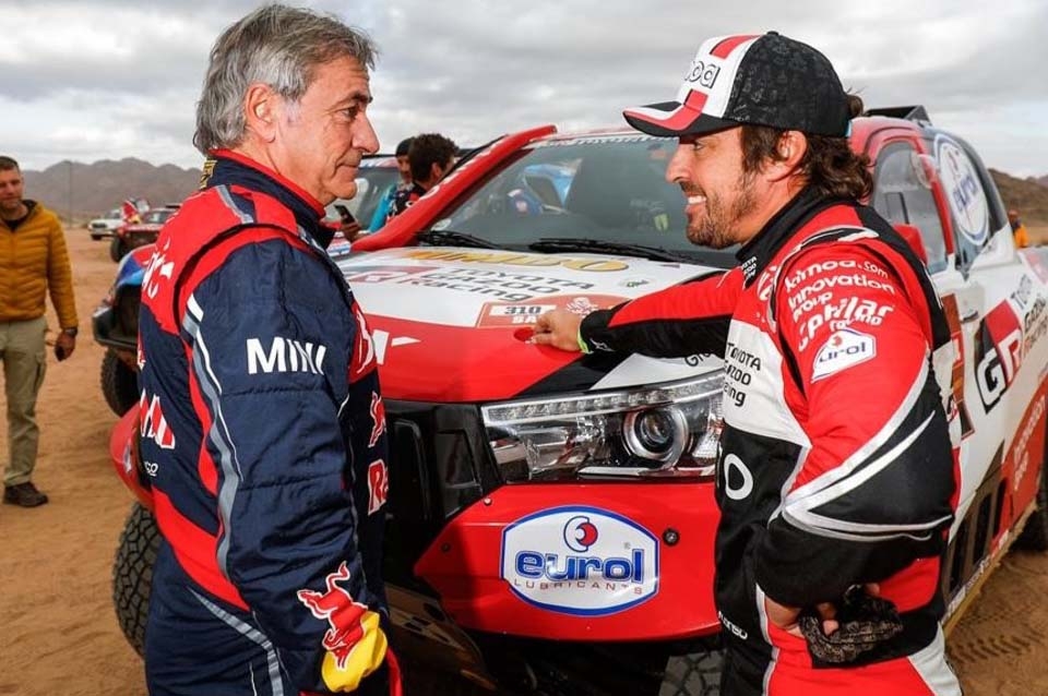Fernando Alonso felicitó de una forma muy particular a Carlos Sainz por su triunfo en el Dakar, y además consiguió sacar una carcajada al nuevo campeón. El asturiano se acercó a saludar al Matador y allí estaban Nani Roma, Álex Haro, copiloto de Giniel de Villiers, y el portugués Paulo Fiuza, copiloto de Stephane Peterhansel.