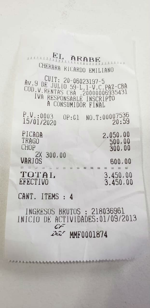 Según la descripción del ticket, les cobraron 2050 pesos la picada, 500 el fernet; 300 el chop y 300 pesos cada vaso de limonada.