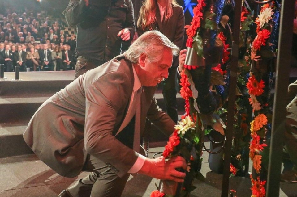 El presidente Alberto Fernández participó hoy de la ceremonia conmemorativa a las víctimas del Holocausto, en la que los mandatarios de los países presentes en el Foro en recuerdo del 75° aniversario de la liberación de Auschwitz, situaron coronas florales en la base del monumento del levantamiento del Gueto de Varsovia.