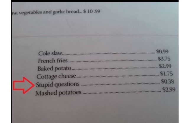Por esta razón, después de la publicación del post, el recargo por la “pregunta estúpida“ se hizo viral pero el restaurante se defendió explicando que en la carta del lugar hay un apartado en el que se enumeran una serie de preguntas “estúpidas” por las que se cobra un suplemento. Es decir, que si bien la práctica es discutible, el comensal que publicó la foto estaba advertido.