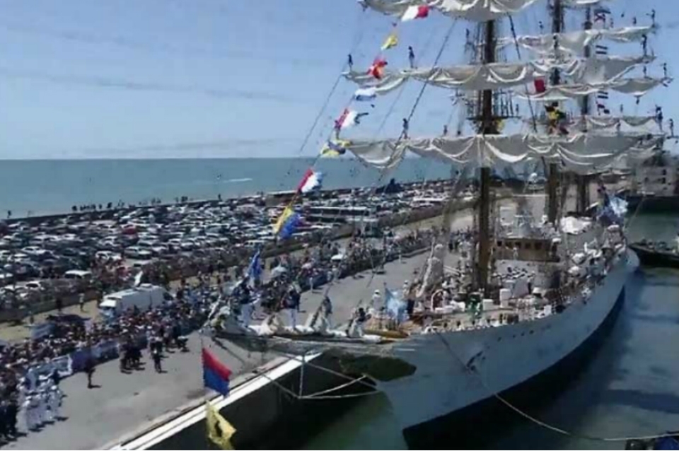 El buque escuela amarró este mediodía en el puerto de Mar del Plata, después de 5 meses de navegación, en los que tocó 15 puertos de 10 países, mientras la banda de música tocaba desde la nave misma la Marcha de San Lorenzo.