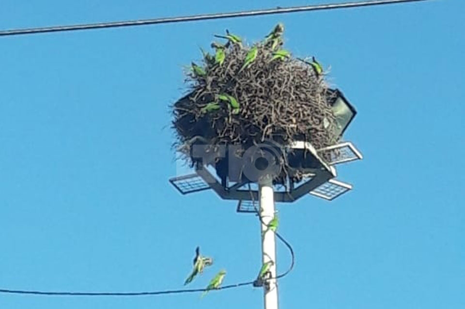 Una bandada de loros anidó en un poste con reflectores y tapa toda la luz durante la noche, haciendo propicio el sector para hechos de inseguridad.