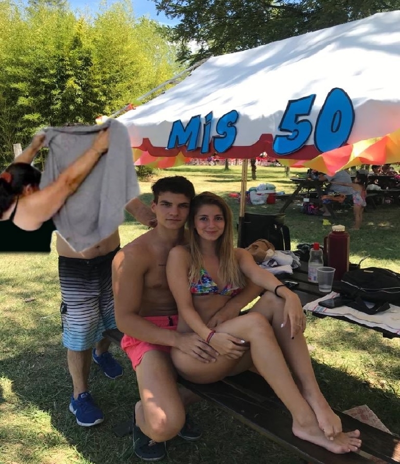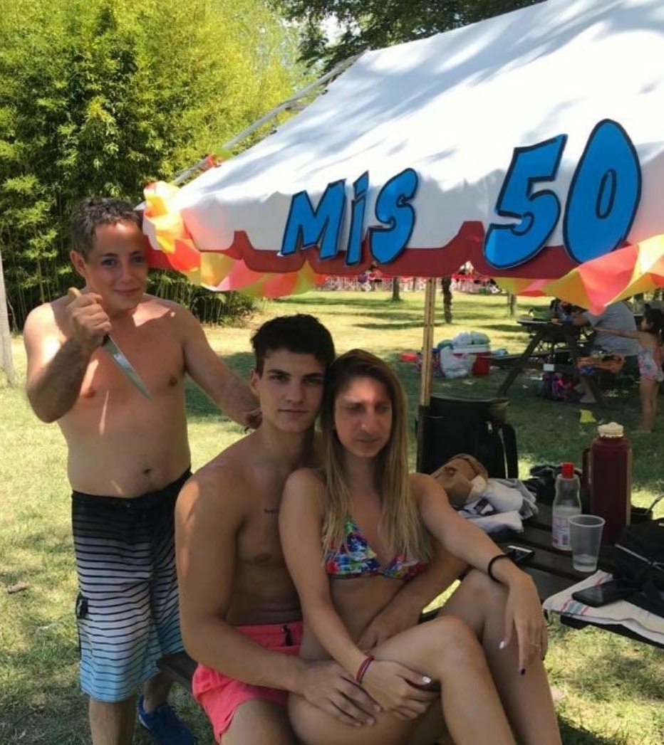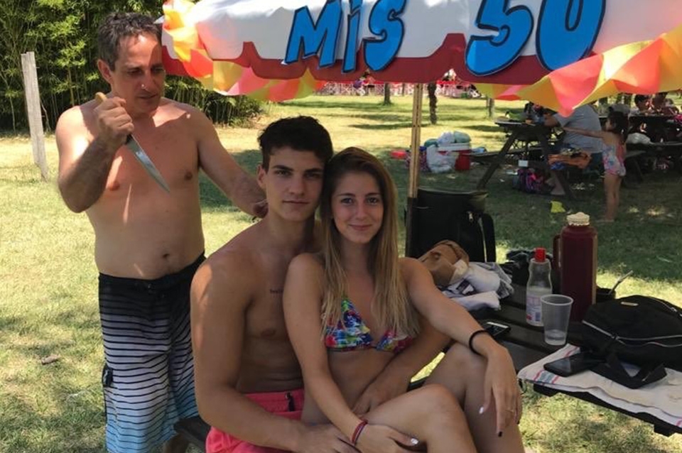 Un joven estaba en el festejo del cumpleaños número 50 de su suegro y se sacó una foto con su novia. Mientras posaban, el padre de la chica quiso sumarse a la fotografía pero con una idea más creativa. El hombre agarró un cuchillo y simuló estar a punto de apuñalar a su yerno por la espalda.