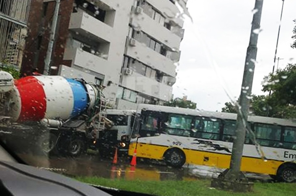 Esta tarde, a las 13:30, un significativo accidente tuvo lugar en la avenida Alem, mano hacia Santa Fe. A la altura de Regatas, un colectivo embistió un camión mezclador de una obra en construcción.
