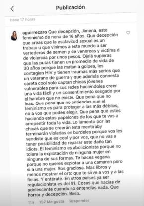 Entre las personas que cargaron contra la actriz la autora Carolina Aguirre, guionista de ATAV, fue contundente: “Qué decepción, Jimena, este feminismo de nena de 16 años. Qué decepción que creas que la esclavitud sexual es un trabajo que vinimos a este mundo a ser vertederos de semen y de venéreas y víctimas de violencia por unos pesos”.