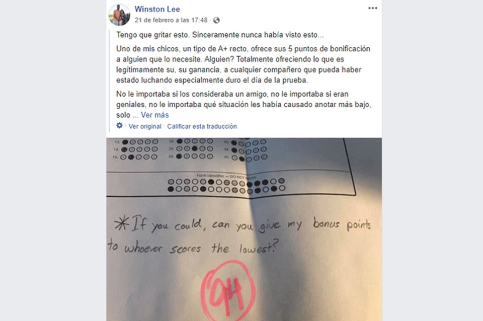 Uno de mis chicos, un tipo de puros A+, ofrece sus 5 puntos de bonificación a cualquiera que lo necesite. ¿Cualquiera? Ofreciendo totalmente lo que es legítimamente suyo, lo que se ganó, a cualquier compañero que haya tenido dificultades especialmente el día de la prueba”, escribió el profesor, admirado.