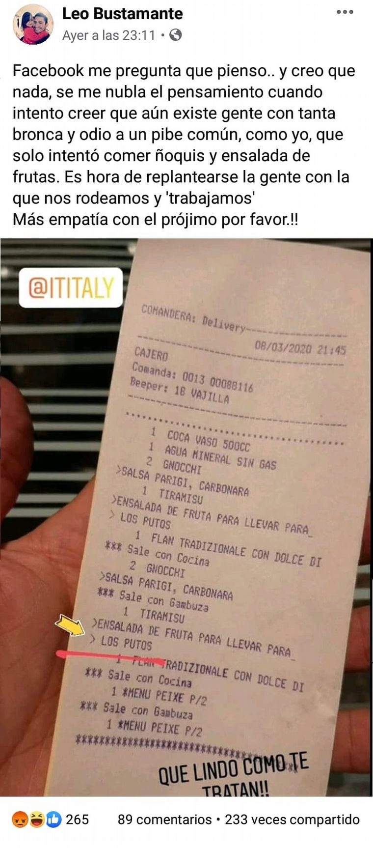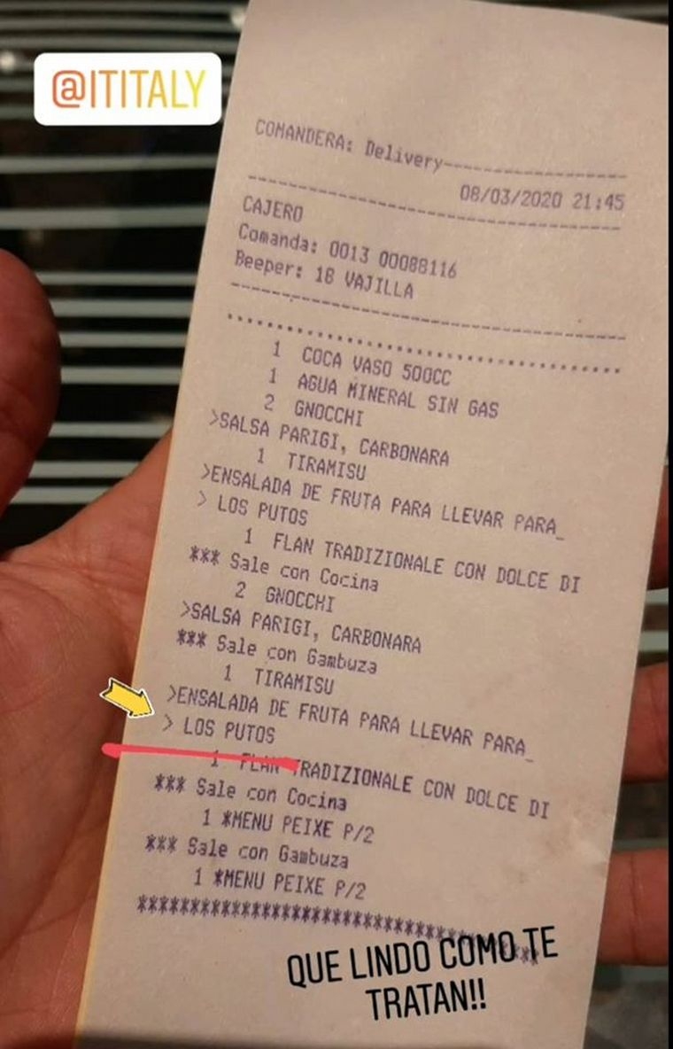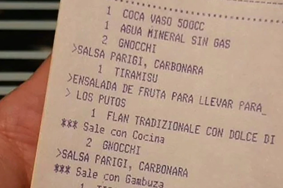 A la hora de recibir el ticket de compra, una anotación les generó indignación: “Ensalada de frutas para llevar para los putos”, estaba escrito en el papel.