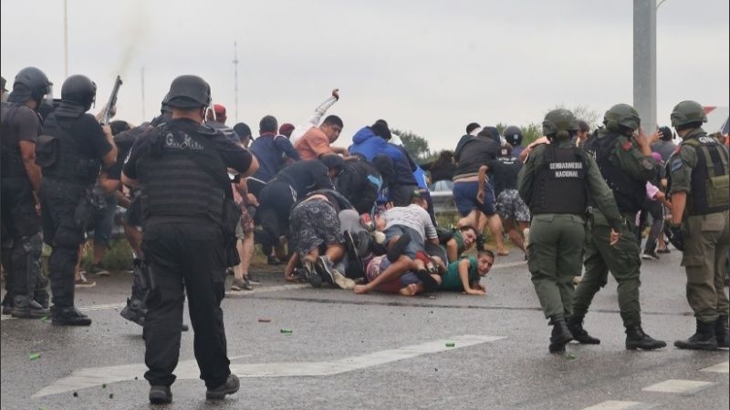 Policías y gendarmes se enfrentaron alrededor de 7 horas con vecinos que querían llevarse parte de la mercadería. El camión transportaba 200 medias reses y volcó en Circunvalación.