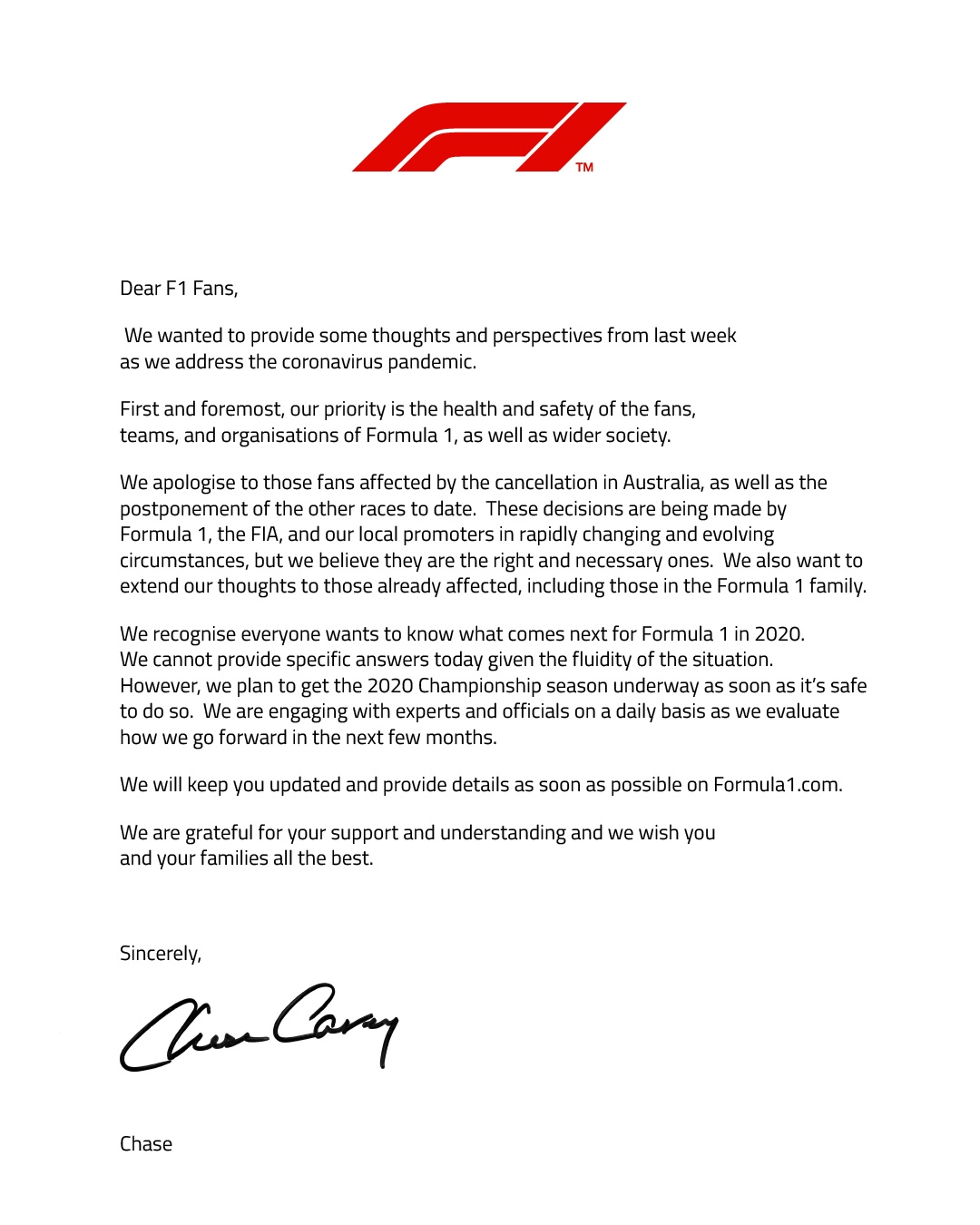 Chase Carey ha pedido disculapas de lo sucedido el fin de semana de Australia a los fans a traves de una carta, justificando el procedimiento que siguieron para suspender el Gran Premio de Australia y las decisiones de aplazar las primeras carreras del torneo porque la informacion cambiaba minuto a minuto.