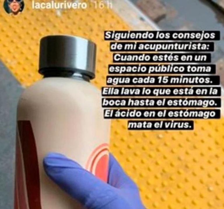 "Siguiendo los consejos de mi acupunturista. Cuando estés en un espacio público toma agua cada 15 minutos. Ella lava lo que está en la boca hasta el estómago. El ácido en el estómago mata el virus", manifestó Calu. Y luego agregó: "Uso guantes cuando estoy en un espacio público".