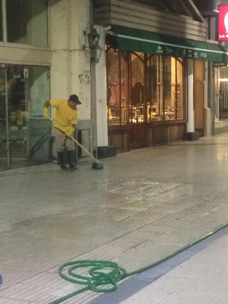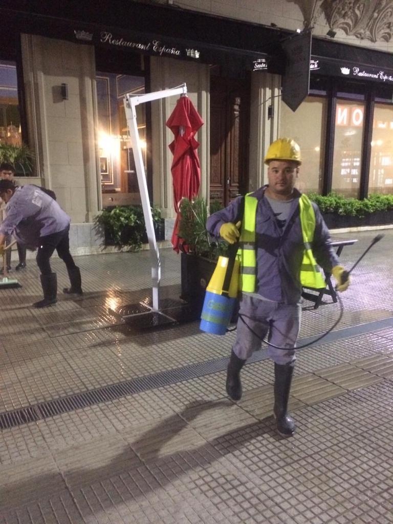 Detergente primero y lavandina después, son los productos utilizados por los trabajadores municipales, organizados en cuadrillas de entre 10 y 15 personas.