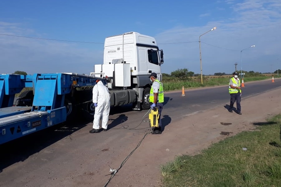 En esos lugares un equipo formado por policías, bomberos y personal de salud, desinfectan las unidades y toman la temperatura a los camioneros que ingresan a la provincia.
