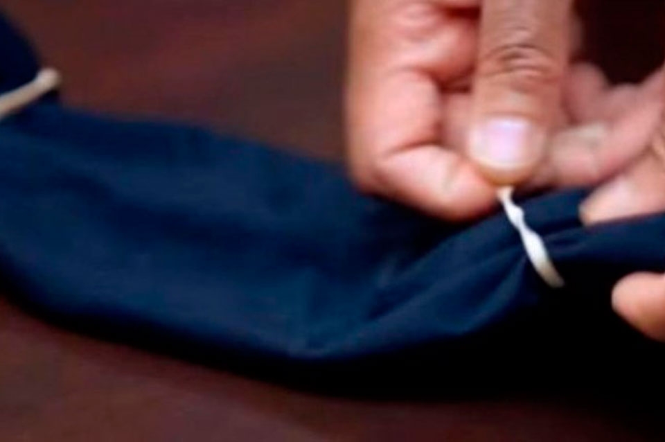 Tirá suavemente el elástico para que los nudos estén metidos dentro del dobladillo. Juntá los lados de la máscara en el elástico y ajustalo a tu rostro.