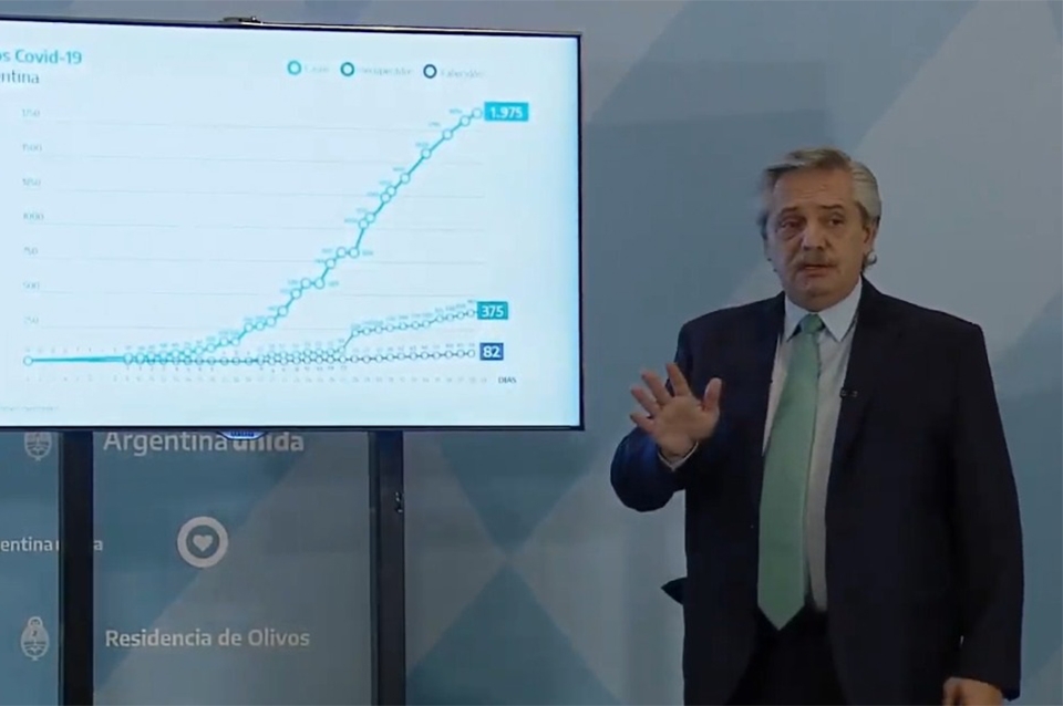 El mandatario consideró que con el aislamiento social, preventivo y obligatorio, Argentina logró "aplanar la curva de contagios" de coronavirus (Covid-19) y exhortó a los argentinos a continuar la cuarentena porque con ello se "seguramente lograremos que la curva de contagio sea mas lenta".