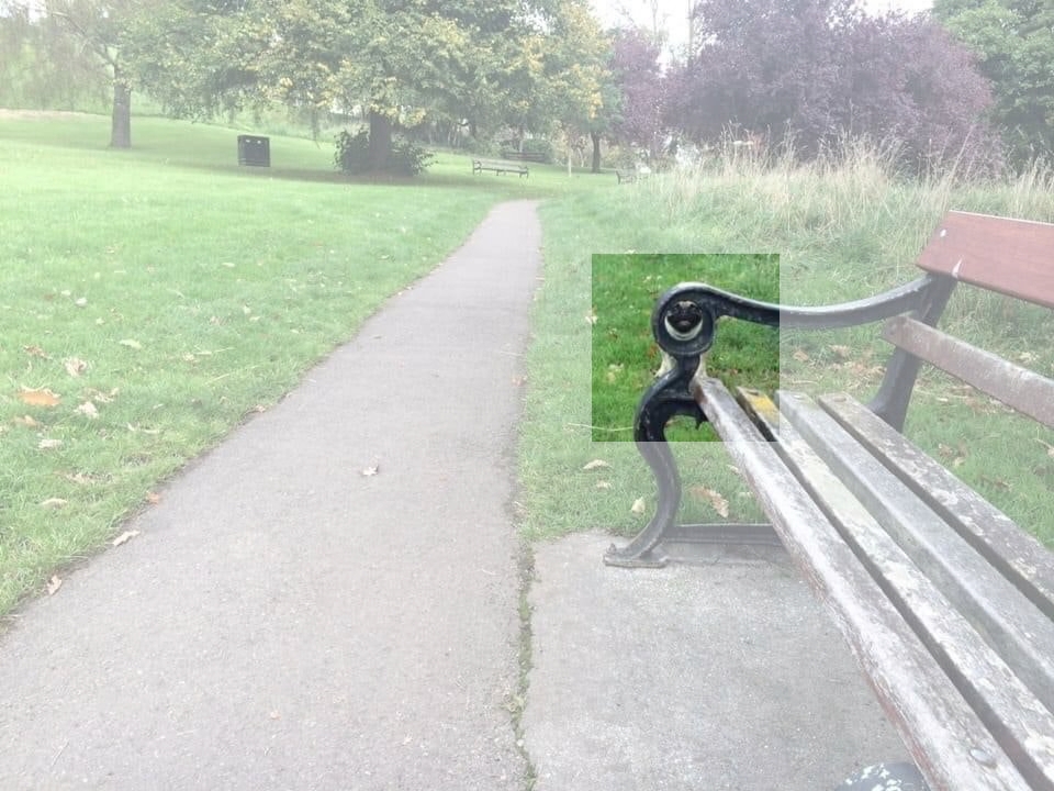 Tal como se puede ver en la segunda imagen, el perro estaba escondido justo detrás del apoyabrazos del banco de madera. Muchos usuarios aseguraron que tardaron horas en encontrarlo, mientras que otros se dieron por vencidos y pidieron ayuda.