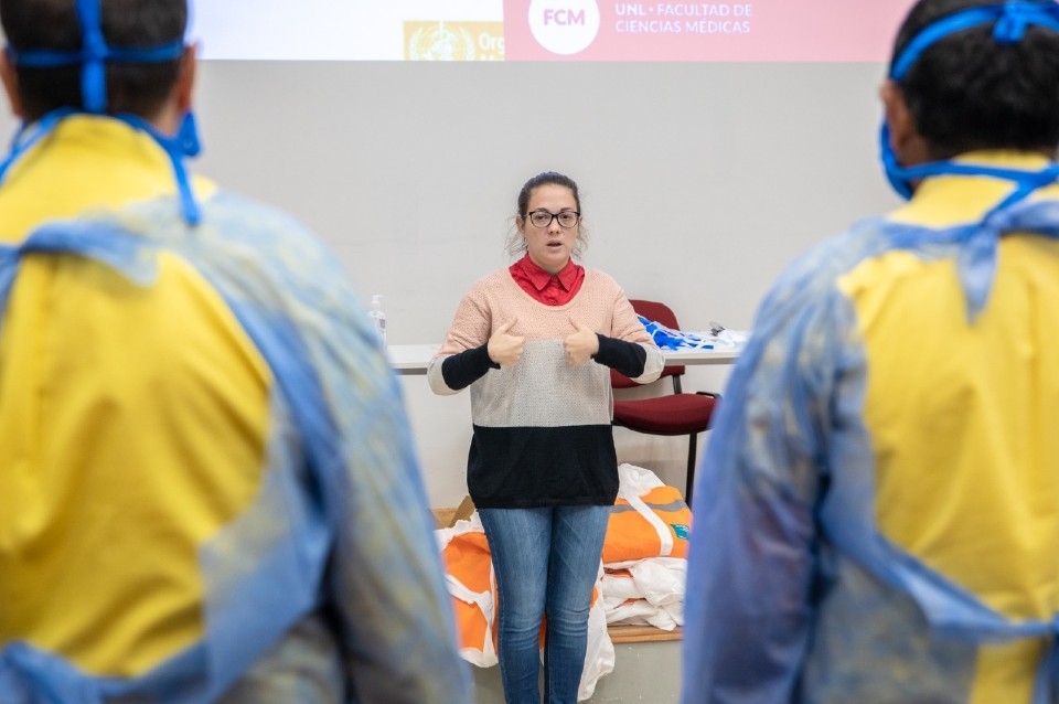 “Desarrollamos una serie de actividades de entrenamiento en lo referente a la puesta y retirada de los equipos de protección personal, sus distintos niveles y para qué situaciones clínicas usarlos”, explicó Gisel Cuevas, docente de Clínica Médica en FCM-UNL, para luego especificar: “Con el equipo de Cobem presentamos la propuesta general instándolos a que la adapten a su protocolo local; en tanto que con el equipo del 107 corrimos escenarios de simulación ya que ellos cuentan con un protocolo propio de actuación”.