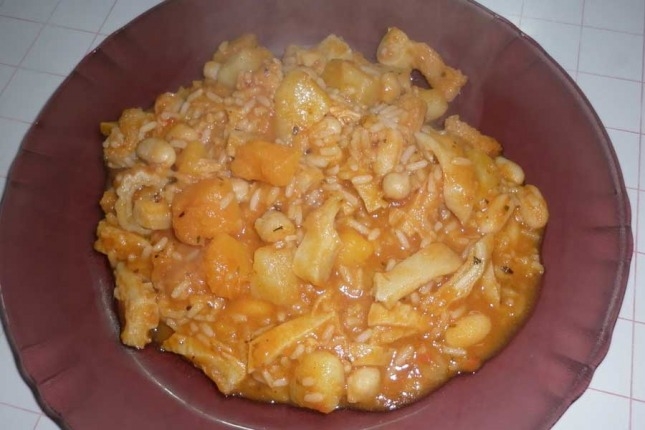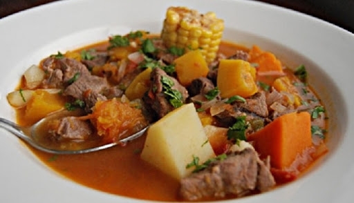 Los ingredientes requeridos son: 1/2 taza de aceite, 1 cebolla grande, 4 dientes de ajo picados, 1 lata de tomates al natural, 1 kilo de carnaza de vaquillona o novillo, 1 ramito de perejil, laurel y orégano, 150 gr de manteca, 1 zanahoria, agua o caldo (1 litro aprox), sal, pimienta, 1 batata, 1 trozo de zapallo, 4 papas, 3 choclos o 1 lata, 1 lata de arvejas, 400 gr de arroz, 1 lata de duraznos al natural. Dorar en el aceite la cebolla y ajos, agregarle la carne cortada en dados y saltear a fuego fuerte. incorporar los tomates picados, el ramito de hierbas y condimentar con sal y pimienta. Dejar hervir un momento y agregarle la manteca, la zanahoria cortada en rodajas, caldo o agua y tapar y dejar hervir despacio. Después agregar la batata, zapallo y papa pelados y cortados en dados, dejar hervir un momento más hasta que estén cocidos, entonces incorporar el arroz, el choclo (si es fresco, en rodajas), las arvejas con su líquido y el almíbar de los duraznos. Tapar y dejar hervir hasta que el arroz esté a punto (20 min de cocción necesaria), 10 minutos antes poner los duraznos cortados en casquitos. Si se ve que le hace falta más caldo, se le agrega, pues debe resultar espesa pero jugosa.