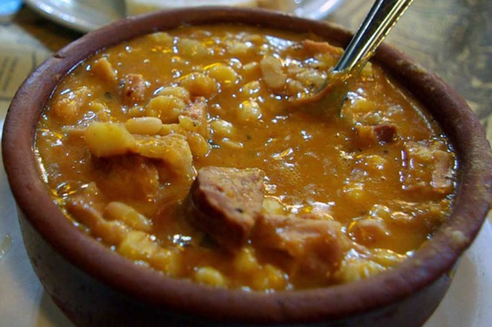 Para el plato patrio por excelencia se necesitan: ½ kg. de maíz blanco pisado, 4 litros de agua, sal, 1 kg. de carne de vaca, unos huesitos cerdo salados, 200 gr. de porotos, 1 pedazo de repollo, 2 ó 3 chorizos, ½ kg. de tripa gorda, 1 pedacito de charque, batatas, zapallo. El procedimiento es laborioso, pero bien vale la pena: hay que lavar el maíz blanco pisado y ponerlo a remojar en el agua durante un día. Al día siguiente, colocarlo sobre fuego lento y dejarlo hervir hasta que esté casi cocinado, salar y agregarle la carne en trozos, los huesitos de cerdo salados y lavados, porotos remojados de antemano y cocinados, el repollo, los chorizos, la tripa gorda cortada en trozos, el charque y dejar hervir unos 40 minutos. Agregarle los pedazos de batata y zapallo, dejando hervir siempre a fuego moderado hasta que todo esté cocinado. Si se ve que necesita agua durante la cocción, agregarla, pues debe resultar espeso pero caldoso. Cuando esté terminada la cocción, completar por arriba (en la olla o en cada plato) con la siguiente salsita, previamente preparada: poner en una sartén 150 gr. de grasa, colocar al fuego y agregarle 1 cebolla picada; cocinar un momento y sumarle 1 ají picadito sin dejarlo dorar, 1 cucharada de pimentón y sal.