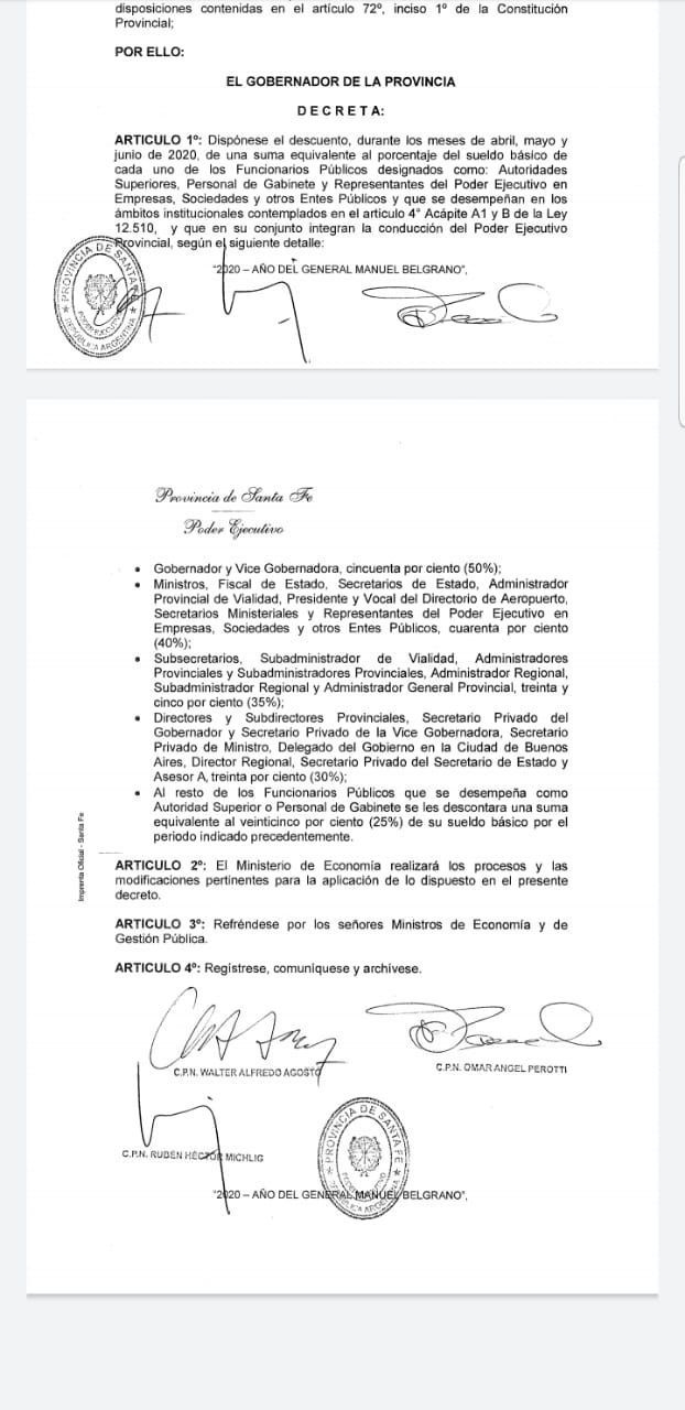 El decreto de Perotti también alcanza a sus ministros, a los que se les redujo el 40% de sus sueldos, y a funcionarios de menor rango entre un 25 y un 35, según el monto que cobran.