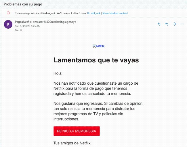 Como muestra la imagen del sitio Infotechnology, se recibe un mail de “Pagosnetflix” proveniente de la casilla de correo electrónico “master@420marketing.agency”. El correo en cuestión llega diciendo que un pago de Netflix fue cuestionado y que debés “reiniciar membrecía”, apretando un botón rojo.
