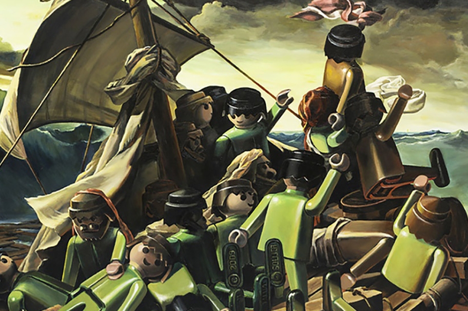 PAS: Cuando comencé en 2007 esta "versión risueña" de "La balsa de la Medusa" de Géricault, mi objetivo era crear una imagen contemporánea. Y cuando vi esta pintura tan dramática con todos los personajes convertidos en Playmobiles, la encontré no sólo divertida sino también cínica y metafórica.