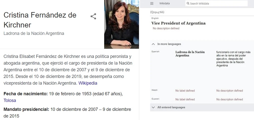 Si bien no se observan cambios al acudir a la página de Wikipedia de la Vicepresidenta, una de la bases de las que toma información la enciclopedia fue modificada por un usuario. La idea era generar problemas al traducir el término de “Vice President of Argentina” al español. En Wikidata, la traducción del cargo fue modificada, por lo que aparecía como”Ladrona de la Nación Argentina“. Luego de la polémica, la traducción fue corregida por otro usuario, aunque aún no se actualizó en el buscador.