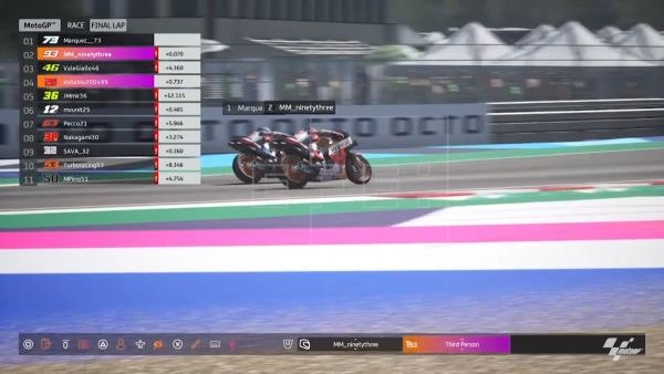 En la última vuelta, Álex Márquez superó a su hermano Marc con un adelantamiento muy medido, aprovechando que el 93 había abierto la puerta en exceso. Los lamentos del hermano mayor no se hicieron esperar, al tiempo que Álex rubricaba un nuevo triunfo para consolidar su talento virtual y erigirse como flamante vencedor de la Virtual Race 4.