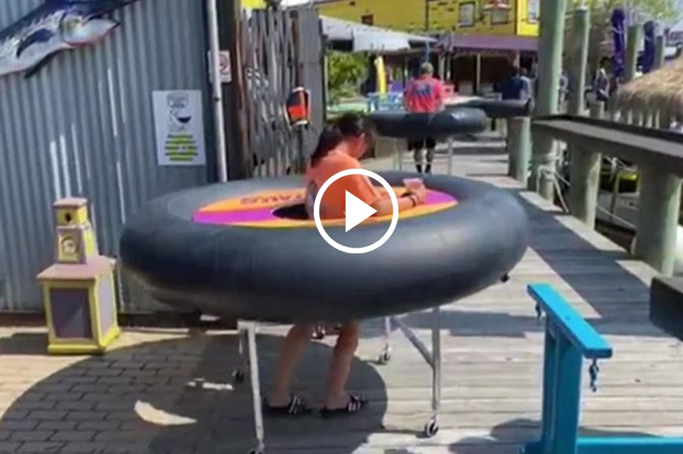 El restaurante Fish Tales, localizado en la ciudad de Ocean City en el estado de Maryland, Estados Unidos, inauguró un novedoso método para abrir en plena cuarentena. Se trata de una serie de mesas gigantes con forma de llantas que mantienen el distanciamiento social entre los clientes.
