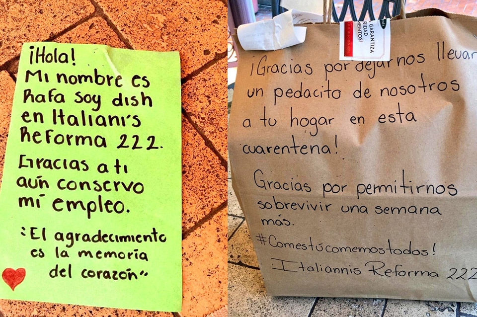 “Hola, mi nombre es Rafa y soy dish en Italiannis Reforma 222. Gracias a ti aún conservo mi empleo. El agradecimiento es la memoria del Corazón”. se puede leer en la hoja que acompañó el pedido. Asimismo en la bolsa de papel marrón que se utiliza para envolver los alimentos había otro mensaje de agradecimiento de parte del equipo del restaurante italiano.