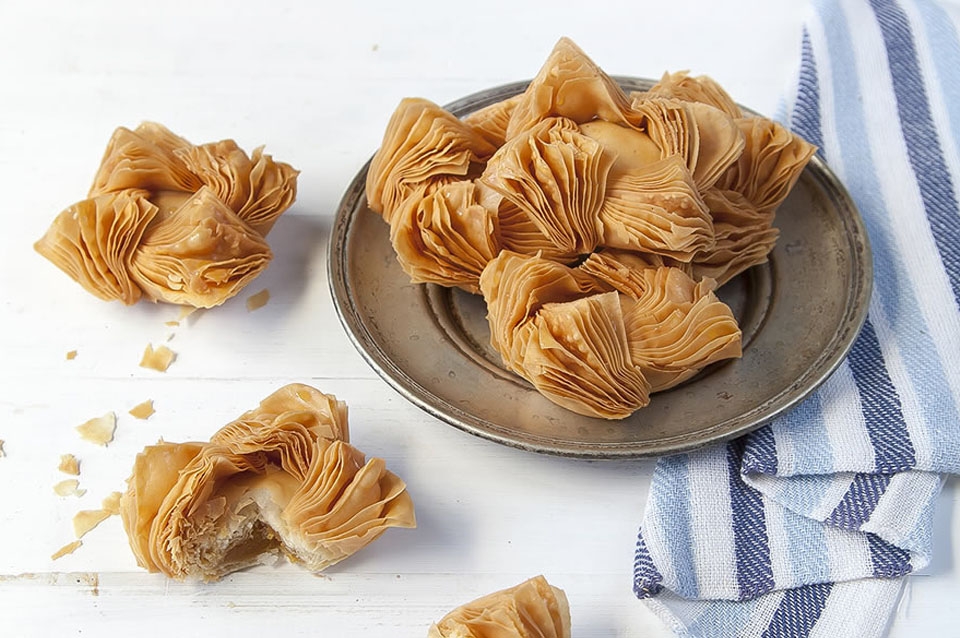 - Estirar la masa en forma rectangular con un grosor fino, untar con la manteca derretida y espolvorear con maicena. Doblar los extremos hasta el centro y volver a untar con manteca, espolvorear con maicena y doblar por la mitad. Sin estirarla, untarla nuevamente con manteca derretida y espolvorear con maicena, llevar los extremos al centro y una vez más untar con manteca derretida, espolvorear con maicena y doblar por la mitad. Dejar descansar durante 30 minutos.