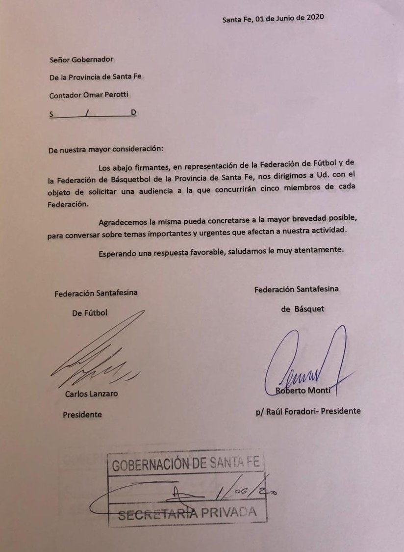 Carlos Lanzaro firmó la misiva por la Federación de Fútbol, en tanto Roberto Monti, actual titular de la Asociación Santafesina, lo hizo en representación de Raúl Foradori, presidente de la Federación de Básquet.