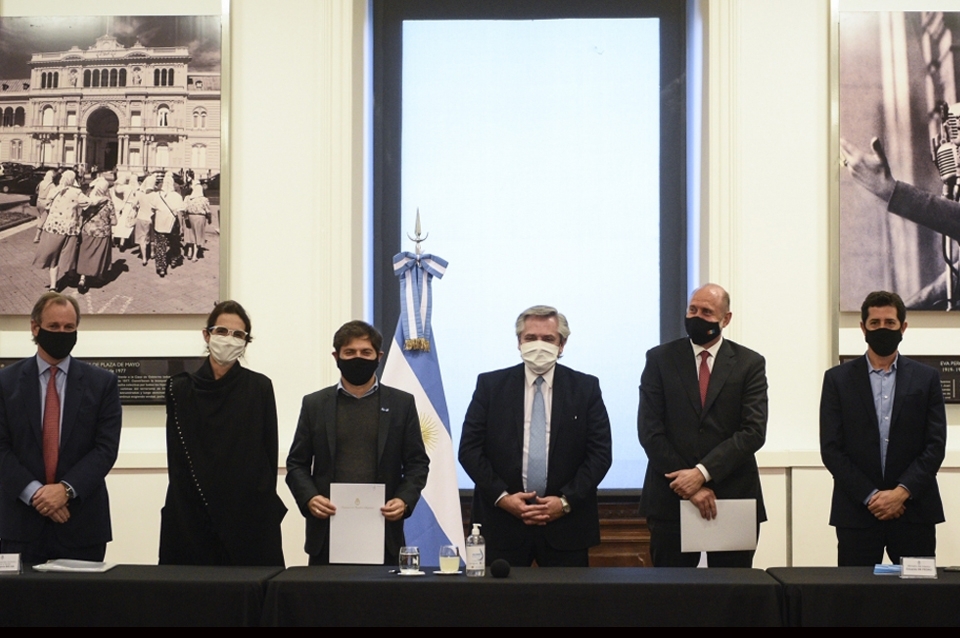 El gobernador Omar Perotti y el presidente de la Nación, Alberto Fernández, junto a la ministra de Desarrollo Territorial y Hábitat de la Nación, María Eugenia Bielsa, firmaron este martes un acuerdo de colaboración para el desarrollo en la provincia de dos programas de esa cartera: el Programa Federal Argentina Construye, y el  Programa Federal Argentina Construye Solidaria.