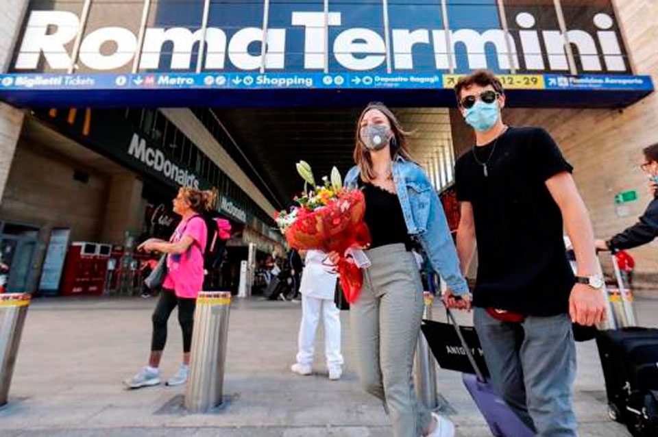 En la terminal más grande de Roma, Termini, los controles de temperatura se hicieron a todos los pasajeros que partían hacia los destinos del norte y del sur del país, en base un decreto de la ministra de Transporte, Paola De Micheli, por el que no se permitirá el acceso a quien tenga más de 37.5 grados.