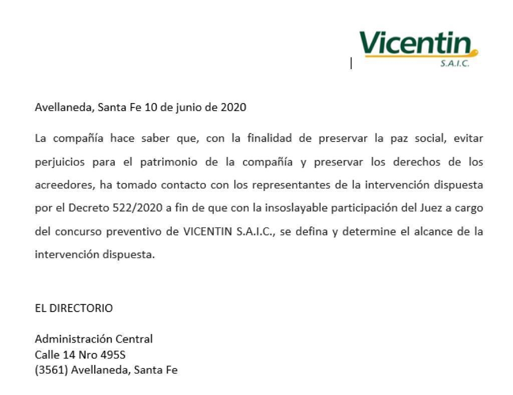 Tras la negativa de este martes de recibir a los interventores del Gobierno, el directorio de Vicentin informó hoy que ya tomó contacto con Gabriel Delgado y su equipo.