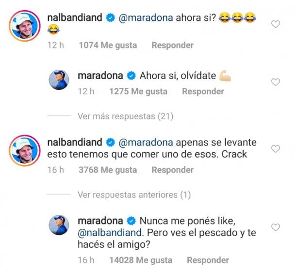 Entre las miles de respuestas y saludos que tuvo la publicación, una fue la de Nalbandian, que le escribió: "Apenas se levante todo esto tenemos que comer uno de esos. Crack". A lo que Maradona, fiel a su estilo, le respondió: "Nunca me ponés like, pero ves el pescado y te hacés el amigo?".