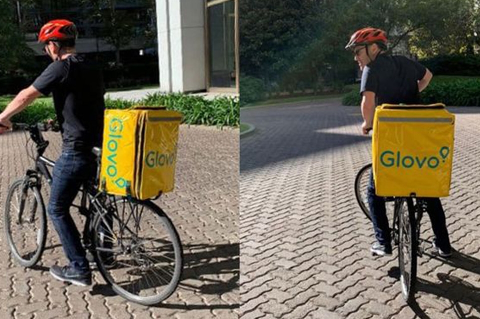 Los empleados aseguran que al hombre le gusta hacer deporte y para no quedarse quieto se sacó el permiso para repartidor de comida, se asoció a una empresa y anda por la calle sin problemas.