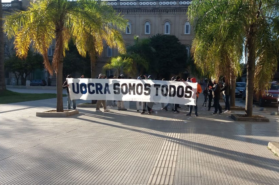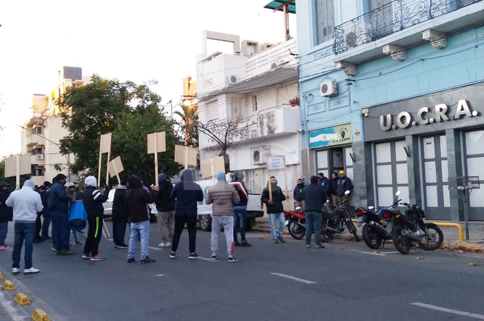 Trabajadores de la construcción nucleados en la agrupación "22 de abril" se manifiestan este jueves por la mañana en las puertas del gremio UOCRA, ubicado en calle Ituzaingó al 2000, entre Las Heras y Alvear.