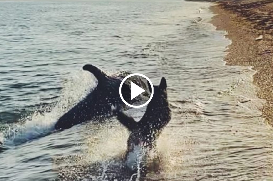 Patrick, el pastor alemán que protagoniza el video, paseaba junto con su dueña por la costa de cabo de Opuk y al ver un delfín acercándose a la orilla, el simpático peludo corrió hacia el marino iniciando un divertido de escondidas, chapoteo y persecución.