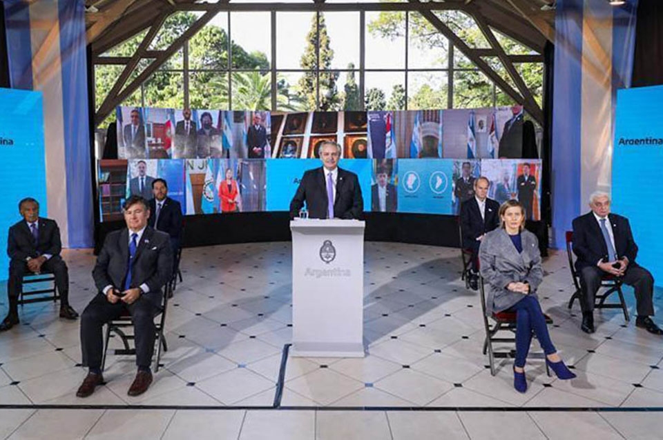 Por teleconferencia, lo acompañaron los 24 mandatarios provinciales -cada uno desde sus provincias- y un grupo representativo del empresariado y la CGT, presentes en la residencia de Olivos.