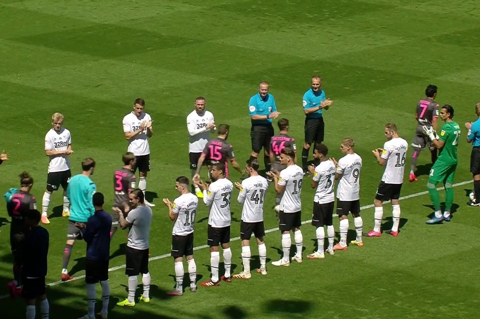 El equipo local, conducido por el neerlandés Phillip Cocu y capitaneado por el histórico delantero Wayne Rooney, formó el tradicional callejón para aplaudir el ingreso de Leeds al campo de juego del estadio Pride Park en la previa del partido válido por la fecha 45.