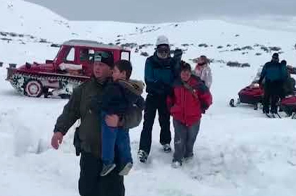 El rescate fue realizado en la Estancia La Madrugada, de donde la mujer, que se encontraba embarazada de ocho meses, y su pequeño hijo habían intentado salir en forma infructuosa en cinco oportunidades por la gran cantidad de nieve acumulada en la zona, informaron fuentes de la fuerza.
